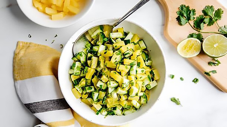 Combineer de ananas, komkommer, limoenrasp, limoensap en koriander. Hussel voorzichtig om te mengen.