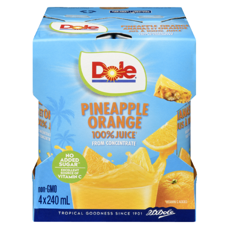 Golden pineapple and vibrant orange juices come together for an exciting, uniquely sweet and tangy taste. Energize yourself with a refreshing can at home or on the go. Available in 4 x 240 mL cans. *100% Pineapple Orange Juice from concentrate with added Vitamin C.