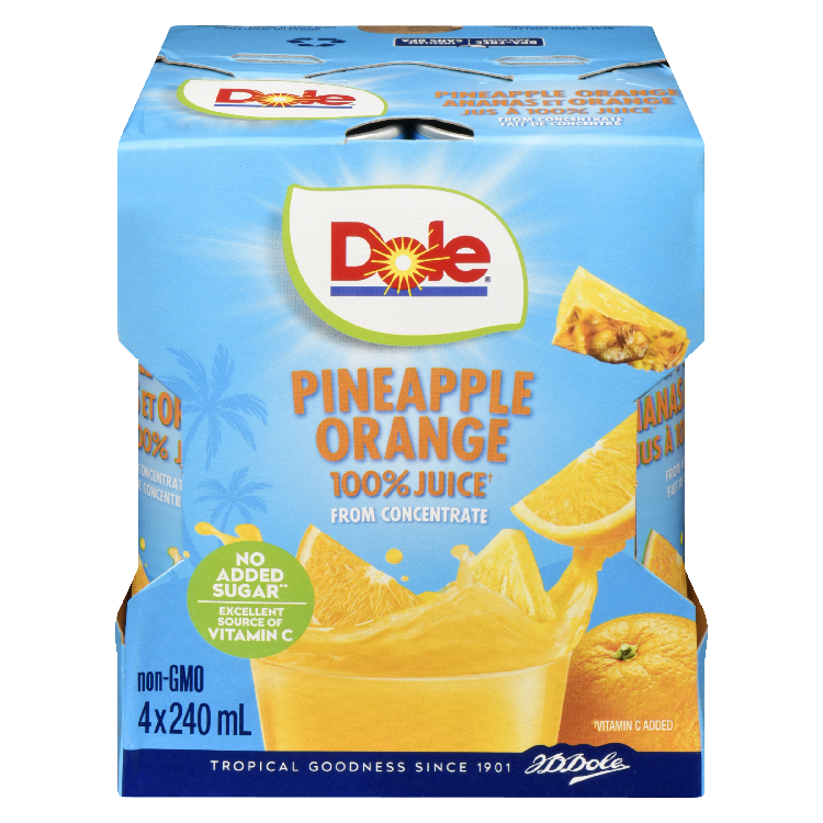 Golden pineapple and vibrant orange juices come together for an exciting, uniquely sweet and tangy taste. Energize yourself with a refreshing can at home or on the go. Available in 4 x 240 mL cans. *100% Pineapple Orange Juice from concentrate with added Vitamin C.