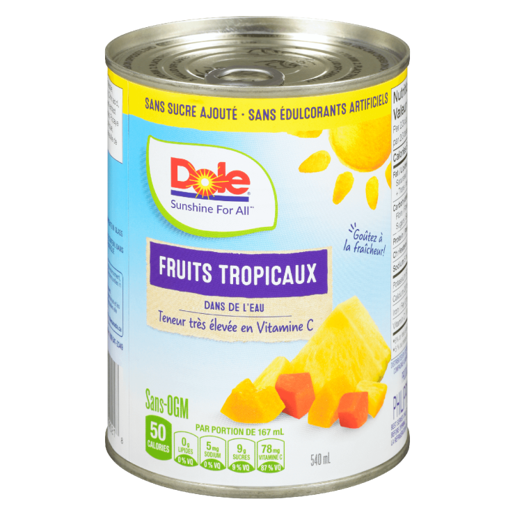 Goûtez la saveur des Tropiques avec un mélange alléchant de morceaux d’ananas et de papayes jaunes et rouges.