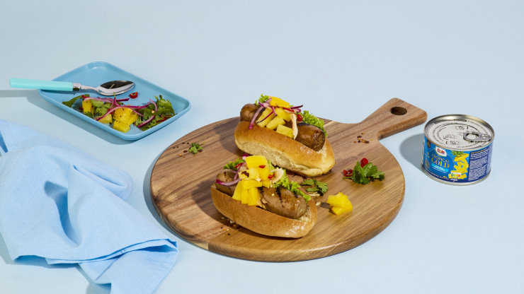 4 gegrillte oder angebratene Hotdogs (oder Würstchen mit Ananasglasur)