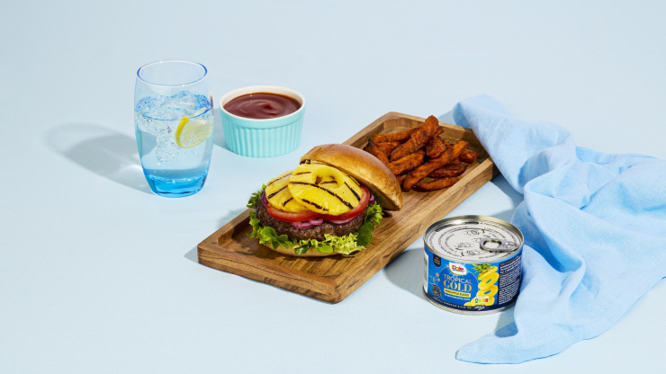 Montez le burger : base de pain, salade, steak, cheddar, ananas, BBQ, chapeau de pain.
