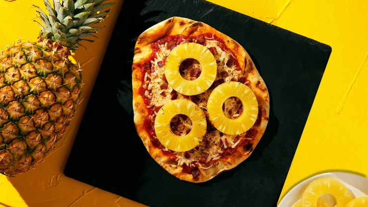 تُرش جبنة الموزاريلا بالتساوي ويوضع فوقها الأناناس واللحم المقدد.