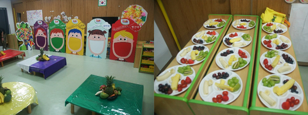 직접 만져 보고 관찰할 수 있도록 신선한 과일과 채소를 책상 위에 가득 올려두었답니다.