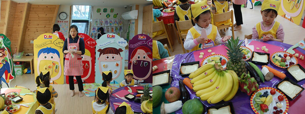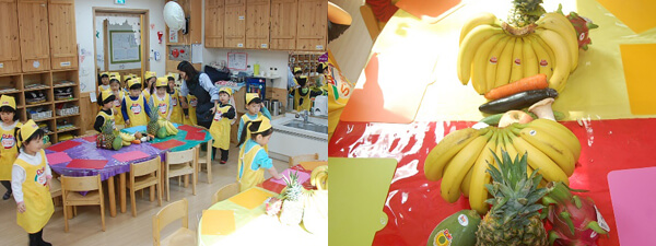 열매 반 친구들이 노란 앞치마를 입고 변신 된 교실로 들어오고 있어요. 모형 과일이 아니라 진짜 과일과 채소들이 짜잔~~이제 재미있는 수업을 시작해 볼까요?