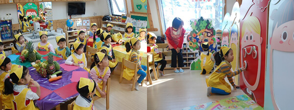 여기는 마곡동에 있는 마곡7 미래꿈어린이집이랍니다. 오늘은 열매반 친구들과 함께 신나고 재미있는 수업을 진행하기 위해 아침 일찍 선생님들이 모였답니다. 열매반이 어떻게 변신할지 열매반으로 들어가 볼까요?