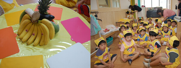 요리선생님과 인사를 하고 5가지 색깔 과일을 잘라 맛있는 과일 샌드위치를 만들어 보았어요.