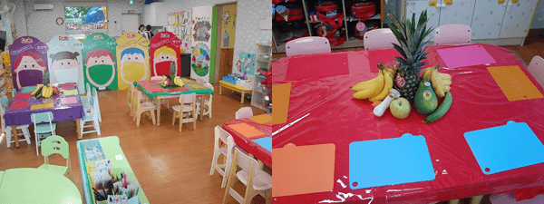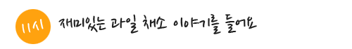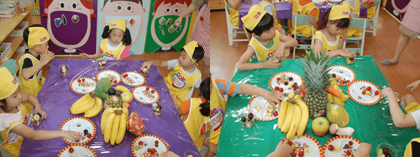 교실에 맛있는 과일과 채소들도 5가지 색깔들로 우리 친구들 책상위에 올라갔어요.
