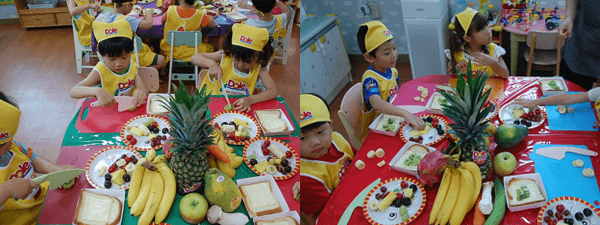 영양선생님이 알려주신 것을 생각하면서 과일 샌드위치를 만들어 보았어요.