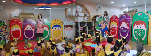 집중해서 듣는 우리 친구들~~ 빨강, 노랑, 초록, 보라, 하얀 색깔 각 색깔이 어디에 좋은 지 영양선생님이 재미있게 설명해 주고 계 시답니다.
