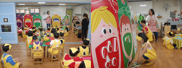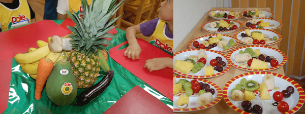맛있고 알록 달록한 과일과 채소를 우리 친구들이 앉은 자리에 뒀어요.
