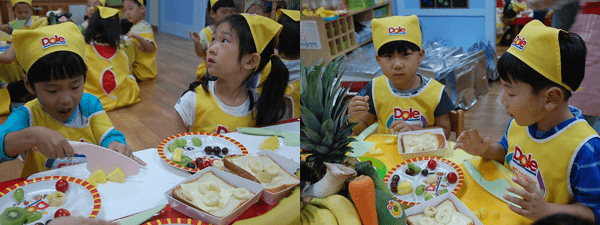 자른 파인애플중 가장 예쁜 것을 찾아 먹어보기도 했답니다. 하얀 바나나를 자르고 식빵위에 올려두는 멋진 친구들!