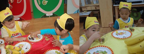 건강 시리얼 샐러드도 완성한 우리 친구들 ~~ 접시에 있는 남은 과일을 먹어 보기도 했어요.