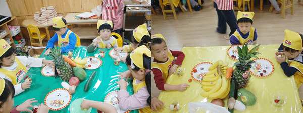 과일샌드위치를 완성하고 알록달록 5가지 색깔 과일과 채소를 컵에 담으며 각 색깔이 어디에 좋은 지 생각하면서 과일 씨리얼 샐러드를 만들었답니다. 너무 잘하는 중계행복어린이집 친구들 덕분에 요리선생님이 뿌듯했답니다.