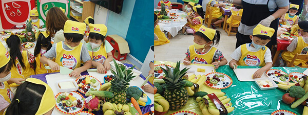 빨강, 노랑, 초록, 보라, 하얀 과일과 채소를 식빵에 넣어 샌드위치를 완성하고 과일컵을 스스로 만들고 있어요.