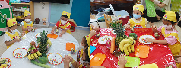피로 회복에 좋은 노란 파인애플을 자르면서 옆 친구와 몇 개로 자를지 이야기 나누는 친구들!