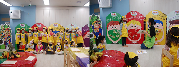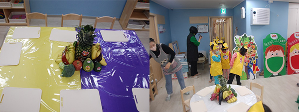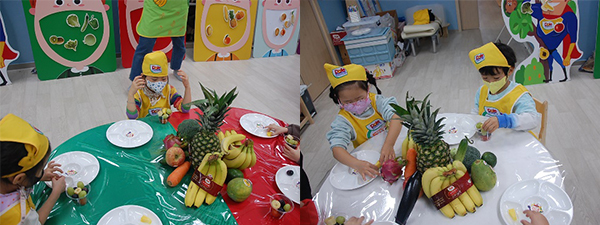 우리 친구들도 입장하자마자 과일, 채소가 가득 교실에 있어서 많이 놀라워하는 모습이었답니다.