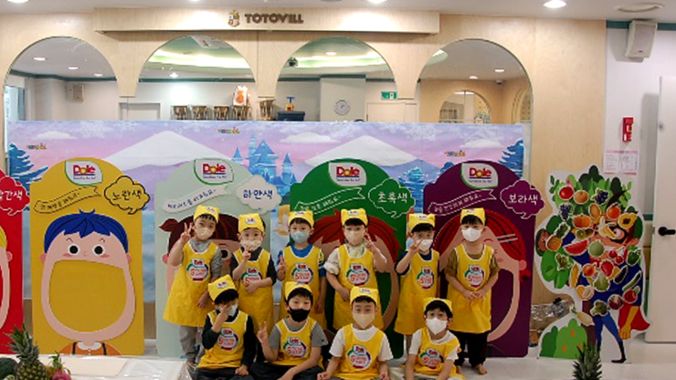 오색 칠판에 빨간 과일과 채소들을 찾아서 입 속에 척척 붙이는 우리 친구~