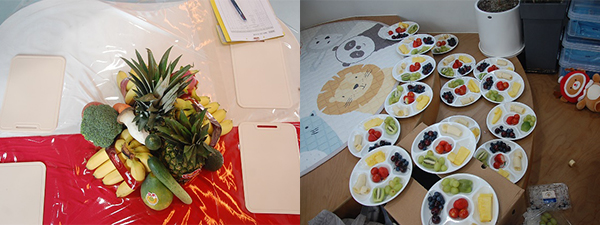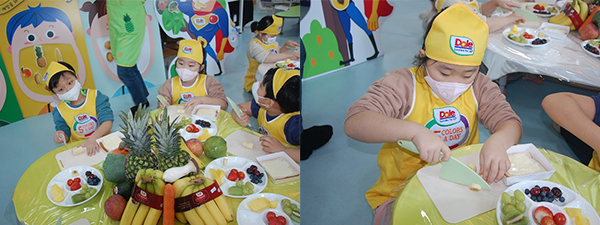 과일 샐러드를 만들고 과일이 가득 차서 알록달록한 투명컵을 보고 모두들 너무 뿌듯해 하면서 건강을 위해 과일과 채소를 골고루 먹을 거라 서로 다짐을 했어요.