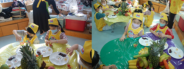 과일과 채소를 자르니 센터 안에 향긋한 향이 가득해서 서로 먹고 싶다며 노래를 불렀답니다.