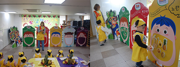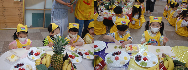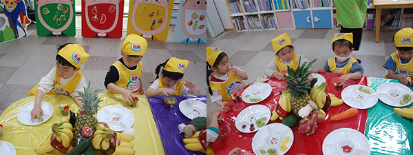 도와주는 노란 파인애플~ 요리 선생님과 각 색깔이 우리 몸의 어디에 좋은 지 다시 한번 더 알아보면서 과일컵