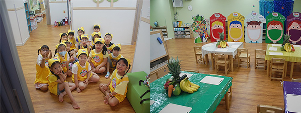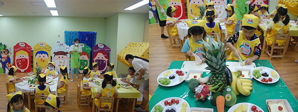 영양선생님과 인사를 나누면서 과일과 채소 이름도 알아보고 빨강, 노랑, 흰색, 초록색, 보라색 과일과
