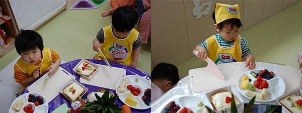 요리선생님의 설명에 따라 열심히 알록달록 과일을 자르고 먹고 샌드위치 위에 올려 보기도 했답니다.