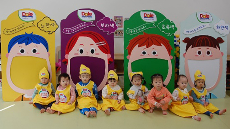 옹기종기 앉아 단체사진을 찍으면서 과일과 채소를 골고루 먹을 것을 약속했어요.