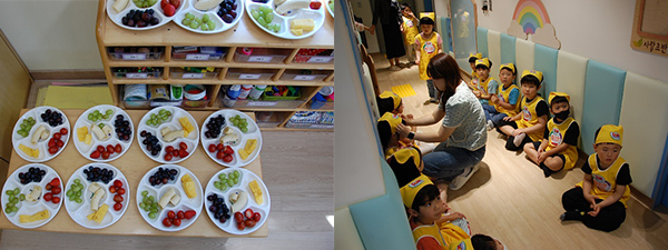 우리 친구들을 맞이하기 위해 선생님들이 5가지 색깔 과일과 채소들을 원형 접시에 담아 요리할 준비를 완료했