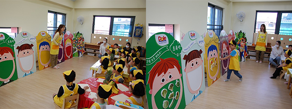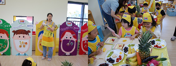 파인애플, 호박, 망고 등의 노란 자석을 찾아서 노란색 칠판 입 속에 다 붙이고, 영양선생님과 함께 과일과 채소