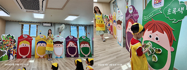 다. 이렇게 5가지색 칠판 모두 색깔에 맞춰 과일과 채소 자석을 붙인 후, 영양선생님이 각 색깔 과채가 우리 몸에