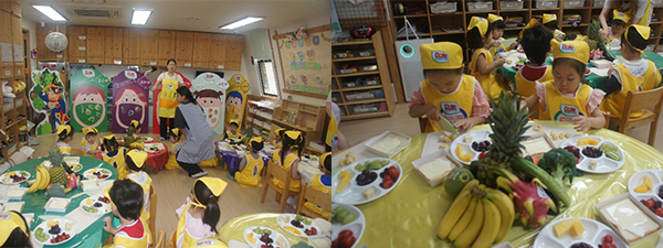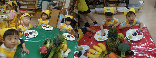 맛있는 과일과 채소들이 우리 친구들 책상 위에 한가득 올려져 있답니다. 미래꿈어린이집 친구들 이제 교실로
