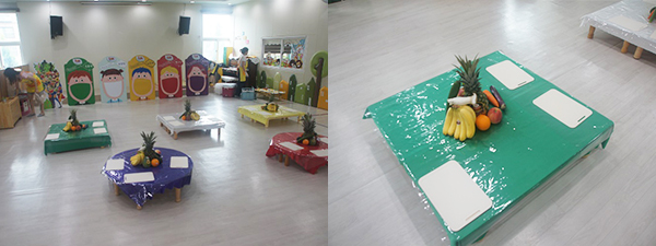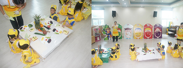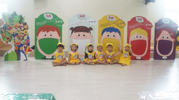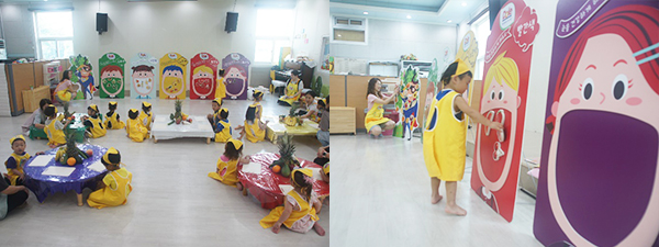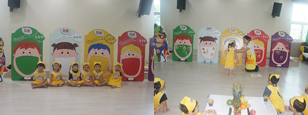 영양 선생님과 함께 빨강, 노랑, 초록, 보라, 하얀 과일과 채소의 명칭을 알아보고, 각 색깔대로 오색 칠판 친구들