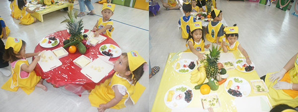 우리 친구들의 호기심을 자극하는 5가지 과일과 채소를 책상 위에 올려두고 요리수업 준비도 완료했답니다.