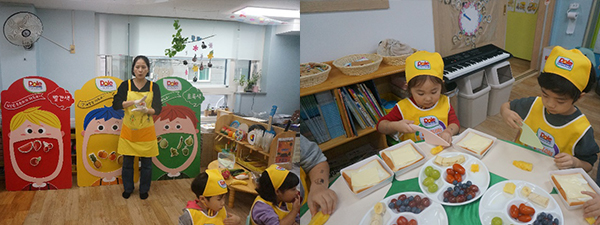 간단한 안전교육이 끝나고 5가지 과일과 채소를 듬뿍 담은 과일 샌드위치를 만들어 볼까요?