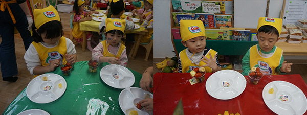 과일 샌드위치를 완성하고 투명컵에 과일과 채소를 쏙쏙 담으면서 5가지 과일과 채소가 우리 몸에 하는 일을 자