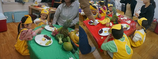 으뜸 어린이집 친구들, 과일박사가 되었으니 과일, 채소 골고루 먹고 건강한 어린이되어요.