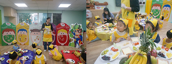 욱 건강하고 튼튼한 어린이가 될 수 있다고 배우면서 같은 색깔 과일과 채소 자석끼리 분류하면서 즐거운 시간
