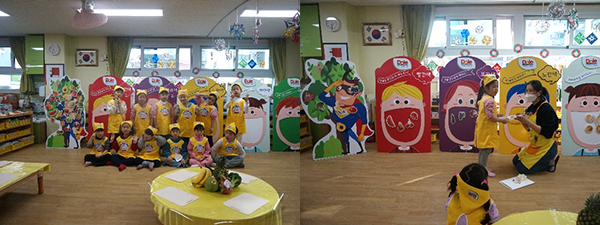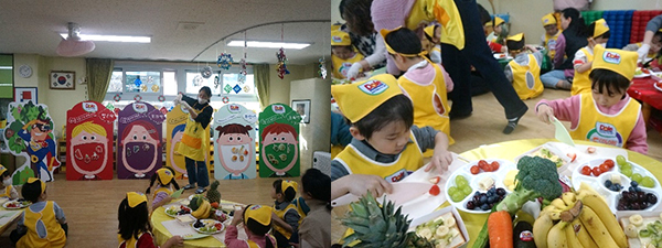 영양선생님과 오색 칠판에 각 색깔 과일과 채소를 붙이고 각 색깔이 우리 몸의 어디에 도움되는지 알아보고 건