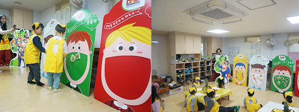 다. 요리선생님이 퀴즈를 내고 그 색깔을 컵에 담으면서 척척 잘하는 응암어린이집 친구들 덕분에 선생님들이