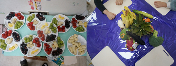 우리 친구들 테이블에는 탐구할 수 있는 생과일과 채소들이 짜잔~ 알록달록 올려져 있어요.