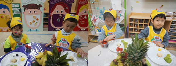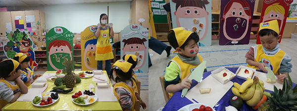 영양선생님이 알려주신 것을 기억하며 빨강, 노랑, 초록, 보라, 하얀 과일을 찾아 칼로 쓱싹 잘라 과일 샌드위치