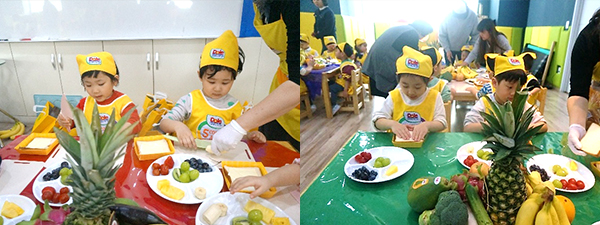 요리하면서 친구를 도와주기도 하고, 서로 어떤 것을 넣는지 보면서 과일요거트컵을 완성했답니다. 과일컵을 완성하고 요