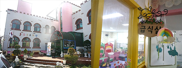 유치원 건물이 보였어요. 2층에 있는 넓은 급식실에 모두 모여서 수업을 진행하기로 했어요. 오늘은 어떤 친구들을 만날지