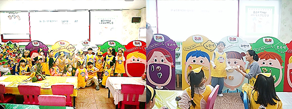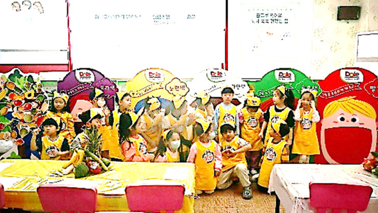 기념사진을 찍으면서 “과일과 채소를 골고루 먹을게요.”라면서 약속하고 있는 늘푸른유치원 친구들.