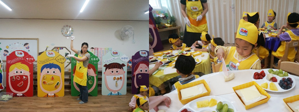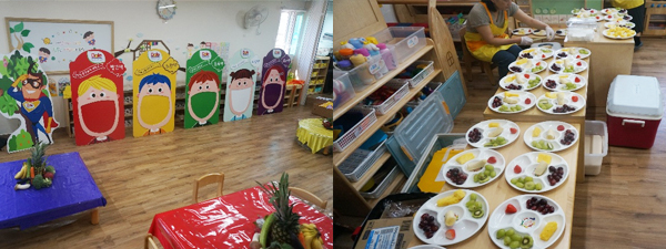 오색 칠판과 건강맨아저씨가 우리 친구들을 기다리고 있어요. 책상이 알록달록 천으로 꾸며지고, 여러가지 과일과 채소들도 한가득 올라왔어요. 요리 수업에 필요한 과일과 채소도 접시에 담아 준비하였답니다.
