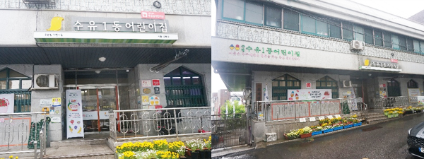 여기는 강북구에 위치한 수유1동 어린이집이에요. 오늘은 갑자기 비가 쏟아져 짐을 옮길 때 힘들기는 했지만 그래도 우리 친구들을 만날 생각에 비를 맞아도 기분이 좋았어요.