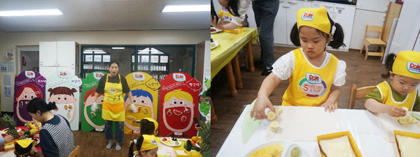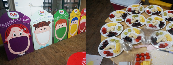 요리 수업에 사용할 과일과 채소들도 예쁘게 접시에 담기고 도마와 칼도 준비 완료됐으니 이제 수업을 시작해 볼까요!