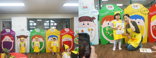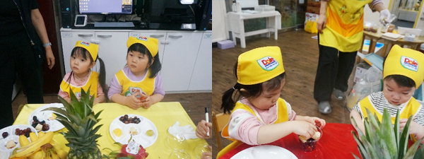 요리 선생님이 오늘 배운 과일과 채소 퀴즈를 내면 우리 친구들이 정답 과일을 찾아 투명컵 안에 쏙 담았어요.
