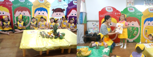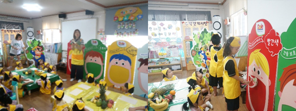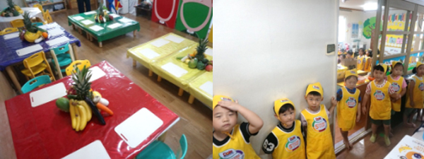 친구들과 함께 할 교실에 오색 칠판, 오색 책상, 그리고 알록달록 과일과 채소들을 준비하고 우리 친구들은